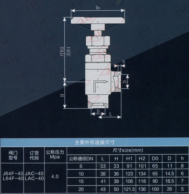 適用范圍 適用于公稱壓力為4.0MPa、公稱通徑為DN6-DN20進出口插焊連接、閥體材料為鋼質的直角截止閥和節(jié)流閥?! ¢y門屬性 公稱壓力為4.0MPa,試驗壓力為6.0MPa,適用溫度為-50°C-+200°C適用介質為氨、氟等?! 表示截止閥 L表示節(jié)流閥 A表示結構形式為直角式 C表示插焊連接 40代表公稱壓力為4.0MPa 40后不標注代表代表閥體材質為鍛鋼。